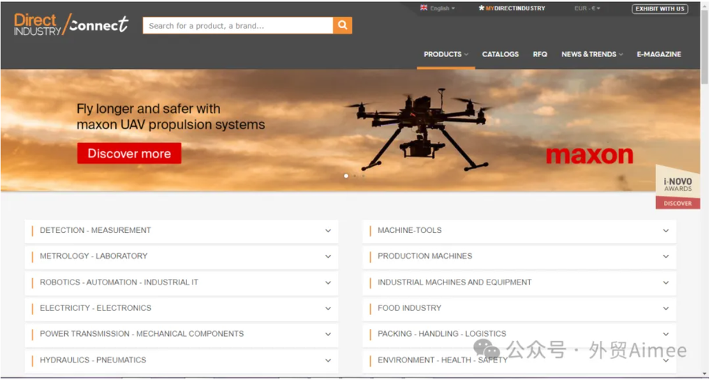 DirectIndustry于1999年在法国成立,是集搜索引擎优化,在线展会,行业网站,专业化B2B平台于一身的新型的多语言,多关键词,多搜索引擎的国际化本土化电子商务推广平台。拥有9种语言(英法德西意日中俄葡)。在线企业及产品展示平台,旗帜广告,电子简报,仅限制造商注册,覆盖200多个国家,200万买家,每月网页点击量14.6百万。