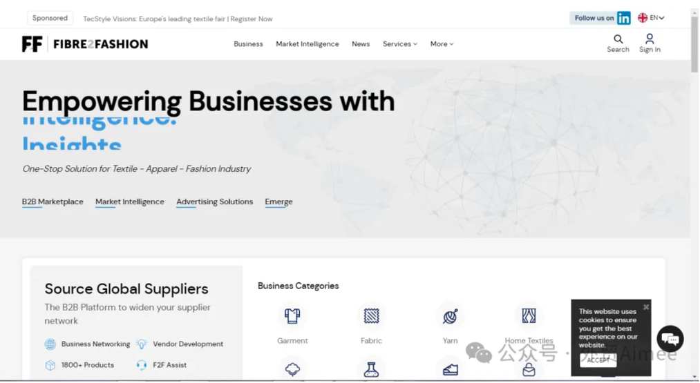 Fibre2Fashion是印度的 B2B 市场。他们拥有印度 60%的在线 B2B 分类市场。他们还享有全球声誉,为 700万供应商和 1.43 亿买家提供服务。他们专注于中小型企业。